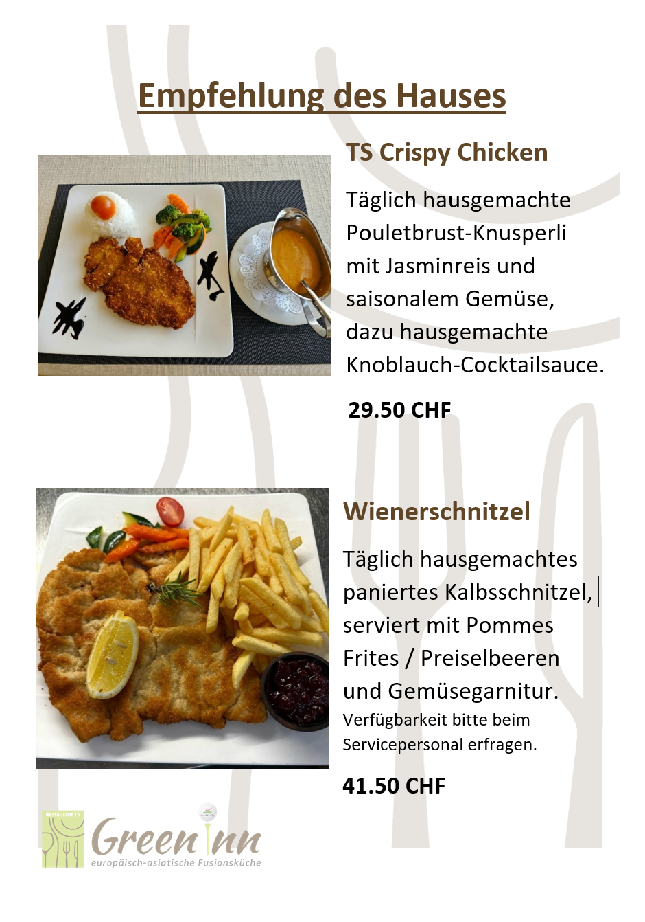 Das Restaurant TS Green Inn bietet Platz für ca. 90 Personen. Zudem bieten wir im beheizbaren Wintergarten, zusätzlich Platz für ca. 40 Personen. Besonders hervorheben muss man den wunderschönen, durch Platanen überdachten Garten, welcher Platz für ca. 80 Personen bietet. Dieser wird zudem wieder bedient. Auf der überdachten Veranda lädt eine Lounge zum Rauchen ein. Unser Restaurant ist selbstverständlich behindertengerecht.